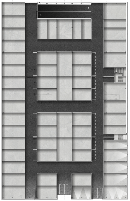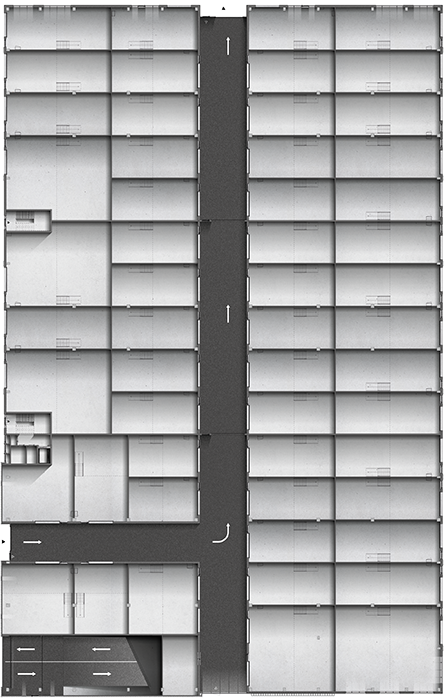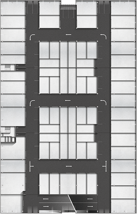 Het gebouw is 100 meter lang, 60 meter breed en 25 meter hoog. De betonnen hellingbanen en gangen meten 7 en ruim 6 meter breed. Hierdoor kun je van de begane grond tot de vierde verdieping makkelijk manouvreren en tijdelijk parkeren. Buiten het gebouw zijn 120 parkeerplaatsen op een afgesloten en beveiligd terrein. Het terrein beschikt over 3 in- en uitritten en is bereikbaar via elektronische toegang.